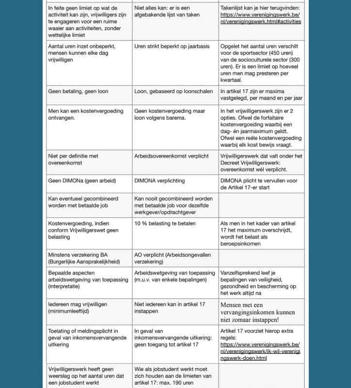 Vrijwilligerswerk is iets anders dan arbeid verrichten voor een werkgever. Het onderscheidt zich ook wezenlijk van wat men Verenigingswerk noemt. Let op, het ‘verenigingswerk’ is afgeschaft. Nu bestaat er een regeling onder wat men Artikel 17 noemt. Al zal je in veel teksten nog ‘verenigingswerk’ lezen. Het essentiële verschil tussen de concepten vrijwilligerswerk en Artikel 17 blijft bestaan. Je mag je dus niet laten afleiden door het woord ‘werk’.
