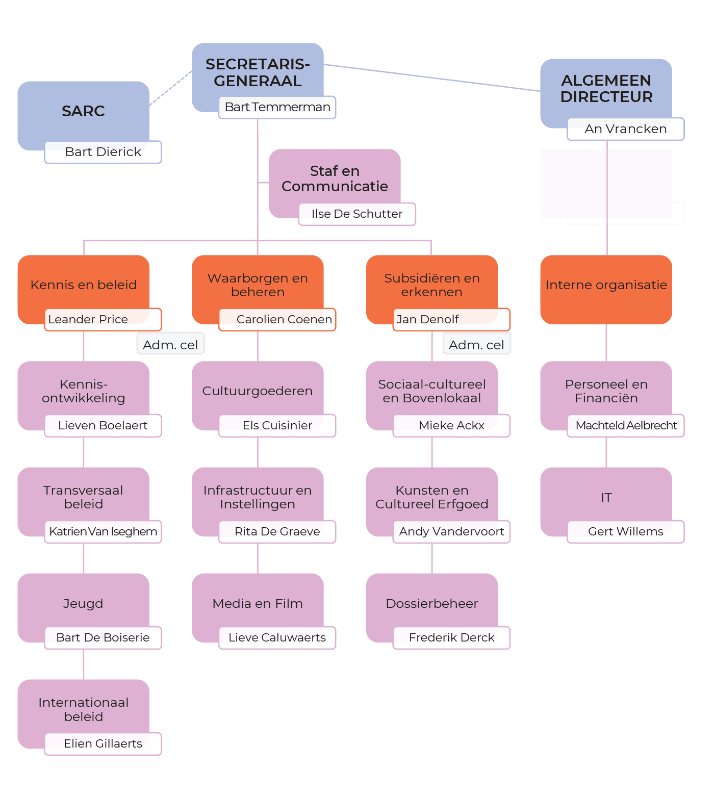 Het beleidsvoorbereidend en beleidsuitvoerend werk met betrekking tot het sociaal-cultureel volwassenenwerk wordt hoofdzakelijk opgenomen door de afdeling ‘Subsidiëren en erkennen’ en de afdeling ‘Kennis en beleid’ binnen het departement CJM.